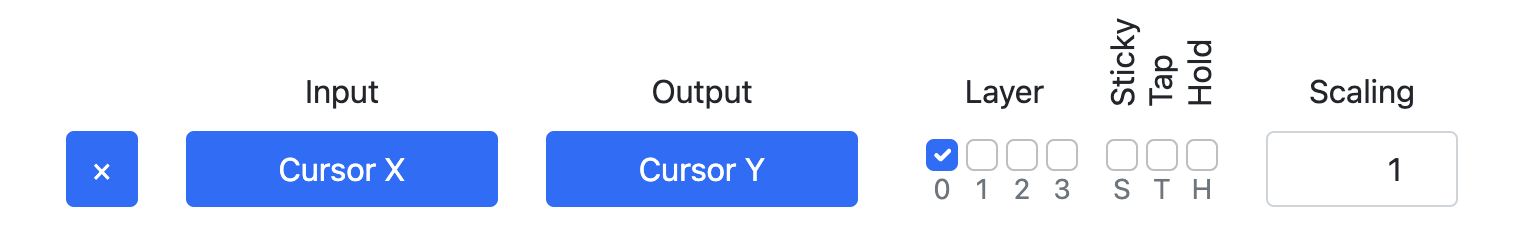 Similarly to keys or buttons, you can also remap axes. For example if you want horizontal mouse movements to be mapped to vertical cursor movements on the computer, add a mapping with the input set to Cursor X and the output set to Cursor Y.