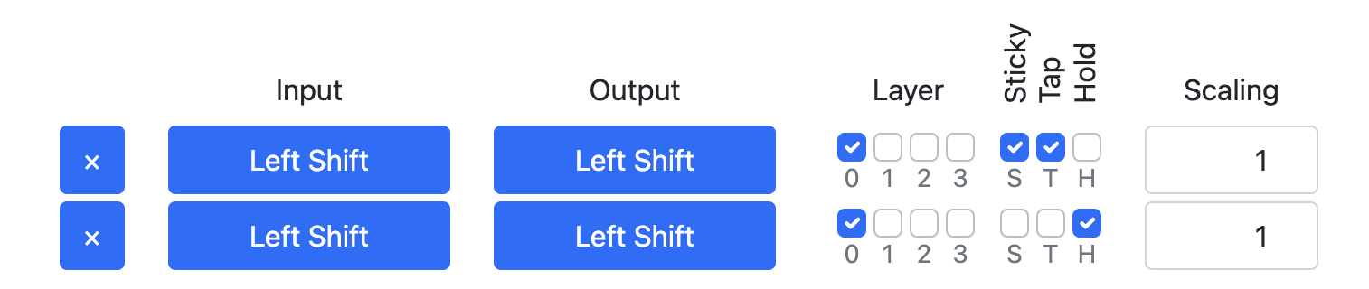 Tap-hold functionality can be used together with the sticky flag. For example you could make it so that the Shift key works as a toggle when tapped (meaning it stays pressed until it's tapped again), but also behaves as a normal Shift key when it's held. This way you could get a Caps Lock-like functionality from the Shift key and use the Caps Lock key for something else. To do that, create two mappings with Left Shift (or Right Shift) as both the input and the output, and enable the tap and sticky flags on the first mapping and the hold flag on the second mapping.
